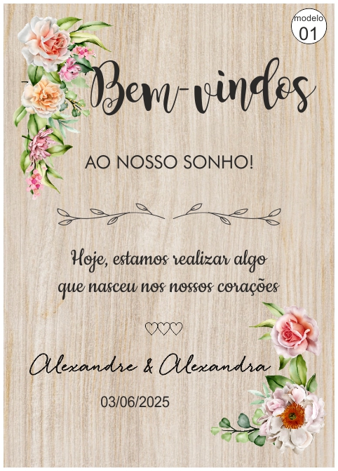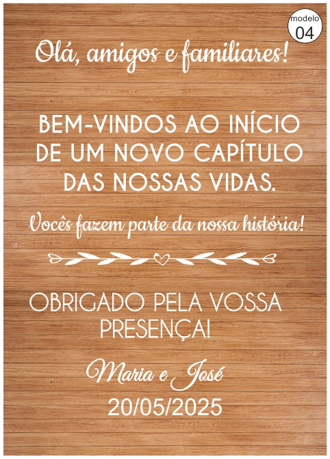 • Painel de madeira com texto branco de boas-vindas e mensagem personalizada.