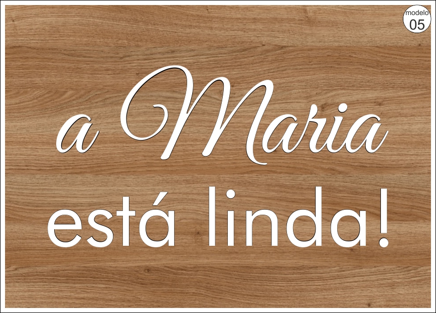 • Placa decorativa com texto 'a Maria está linda!' sobre fundo de madeira