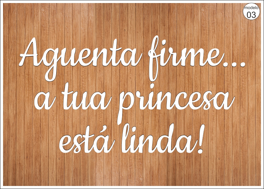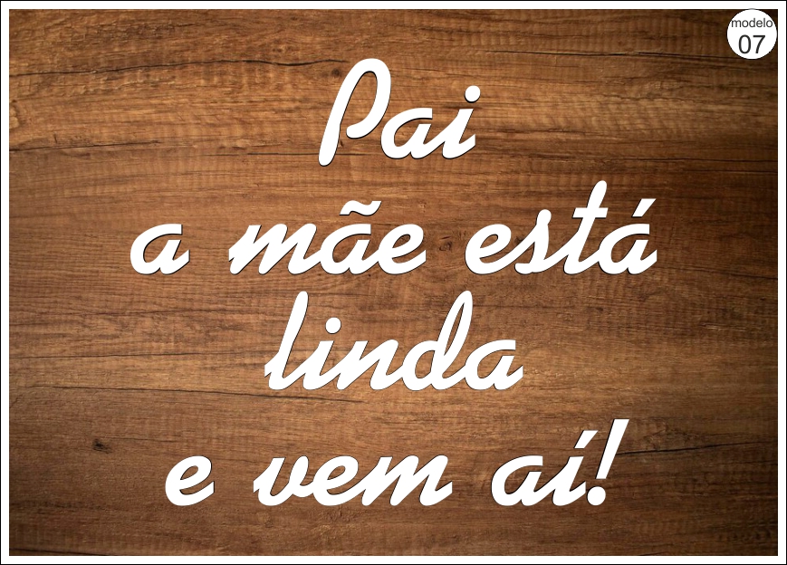 Texto branco sobre fundo de madeira dizendo 'Pai a mãe está linda e vem aí!' com selo 'modelo 07'