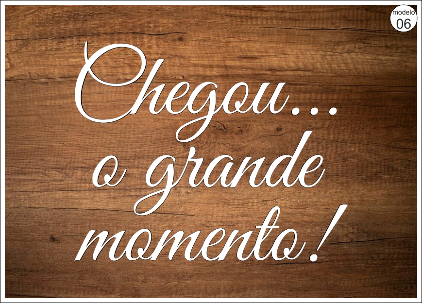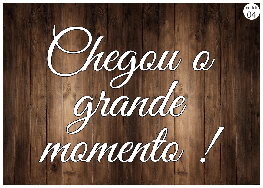 • Texto branco em fundo de madeira dizendo 'Chegou o grande momento !' e etiqueta 'modelo 04'.