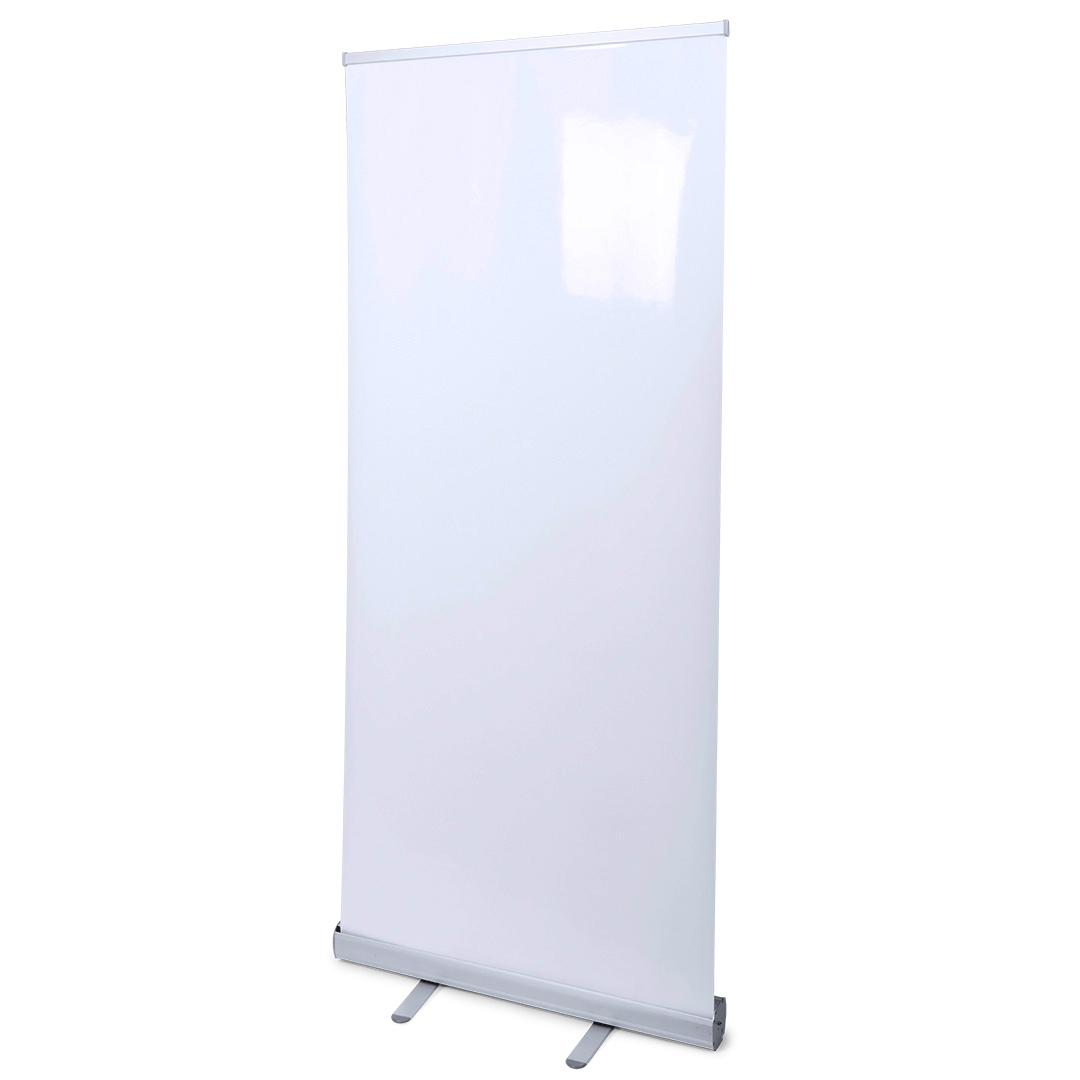 • Estande roll-up branco com base metálica prateada