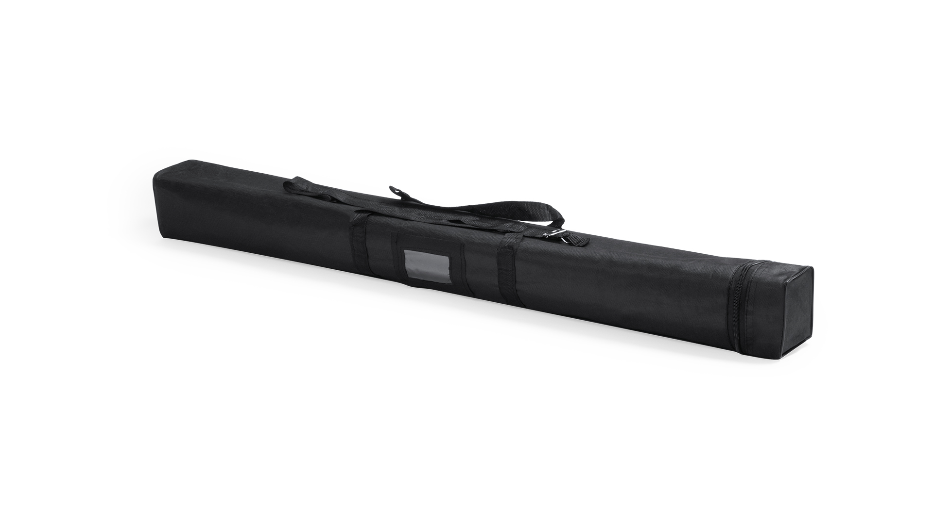• Capa preta comprida com alça e fecho, sobre fundo branco