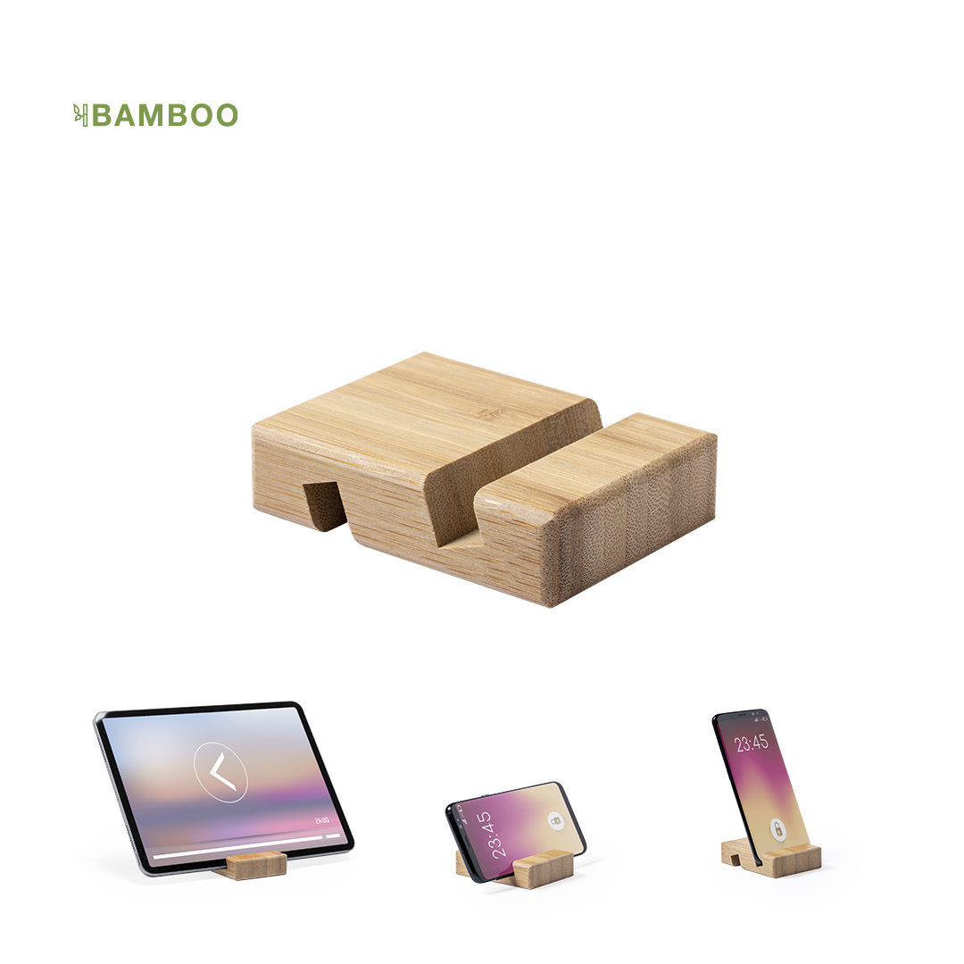 Suporte para dispositivos móveis (smartphones e tablets). Fabricado em resistente bambu de acabamento lacado, com orientação/suporte nas duas faces. bambu